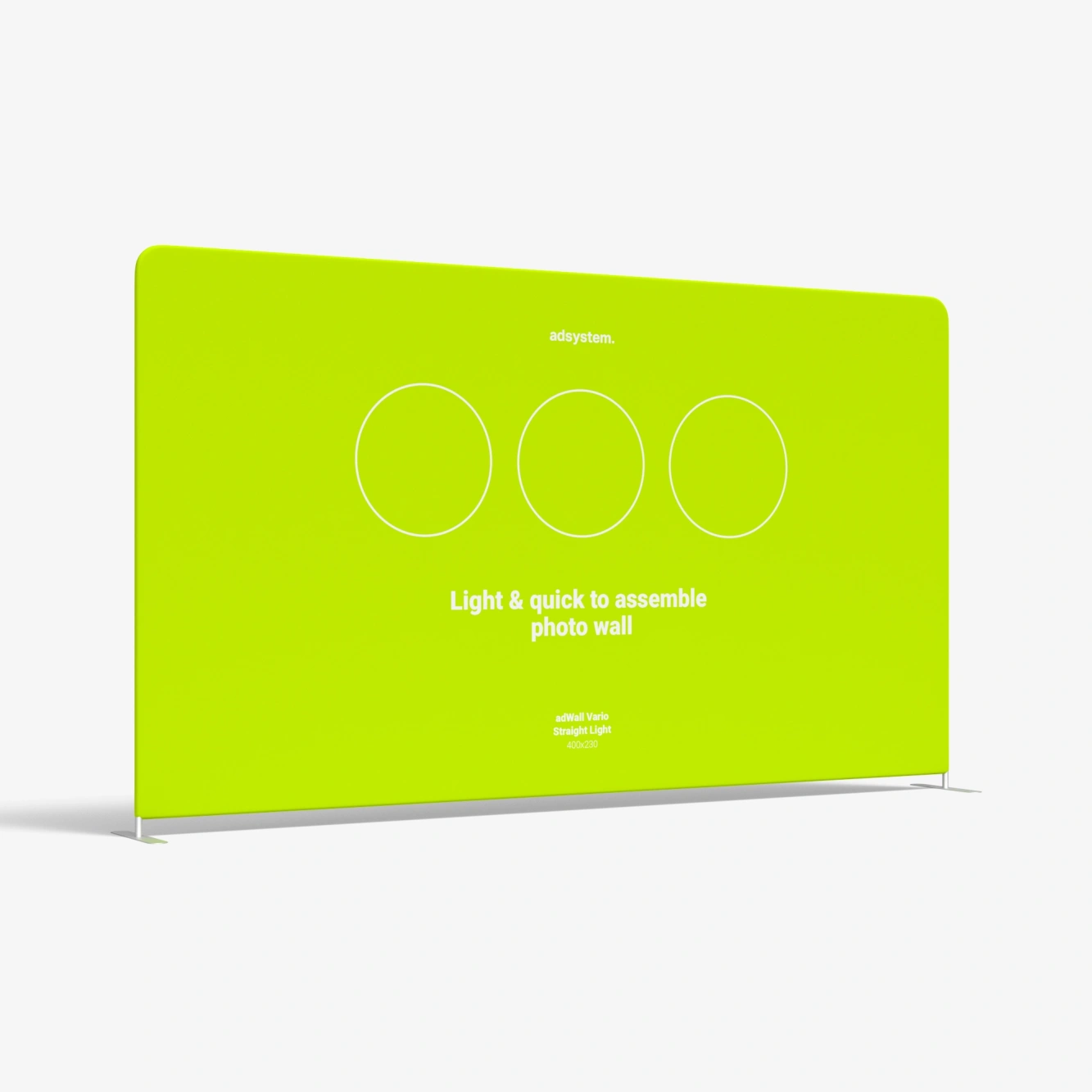 El photocall publicitario grande adWall Vario Straight Light 400 a doble cara combina diseño y funcionalidad para empresas que buscan una presencia visual sólida. Ideal para campañas de marketing, bodas, celebraciones o ferias, este sistema garantiza una presentación profesional en cualquier entorno interior.